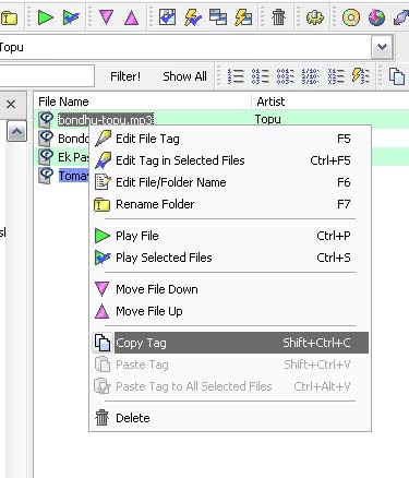 আপনি চাইলে আপনার ট্যাগ করা গান কপি করে ট্যাগ করেন নাই এমন গান বা গানগুলোর উপর পেস্ট করলেই সেই গান বা গানগুলোও ট্যাগ হয়ে যাবে। যেমনঃ আপনি ট্যাগ করেছেন এমন একটা গানে ডান ক্লিক করে Copy Tag (অথবা Shift+Ctrl+C চাপুন ) এ ক্লিক করুন, ফলে ঐ গানের সব ইনফরমেশন কপি হবে।