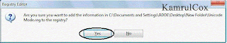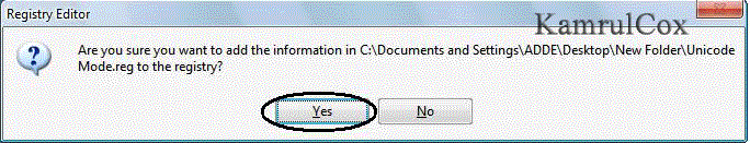 আপনার সেভ করা বা কারো কাছ থেকে সংগ্রহ করা কোন রেজিস্ট্রি ফাইলকে রান করার জন্য ফাইলটির উপর ডাবল ক্লিক করুন। তাহলে নিচের ছবির মত Yes,No আসবে। Yes এ ক্লিক করুন। তারপর OK দিন। কয়েকবার Refresh করুন। Right Click> Merge করেও রান করা যায়।