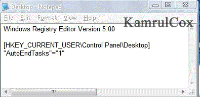 অর্থাৎ AutoEndTasks আগে ডিজেবল করা ছিল কিন্তু আমি এখন এনাবল করে দিলাম। এর ফলে উইন্ডোজ কখনো হ্যাং হয়ে গেলে AutoEndTasks এর মাধ্যমে তা নরমাল হবে। প্রয়োজনীয় পরিবর্তন করার পর ফাইলটি সেভ করার জন্য Ctrl+S চাপুন এবং ক্লোজ করে ফেলুন ( উপরে ডানপাশের x চিহ্ণতে ক্লিক করলে ক্লোজ হয়ে যাবে)। এবার ফাইলটি রান করুন। কয়েকবার Refresh করুন। তাহলে পরবর্তীতে সেটিংসটির কার্যক্রম ভোগ করা যাবে।