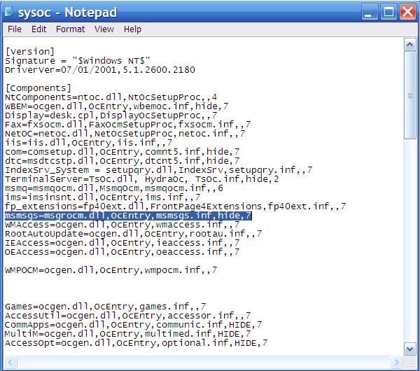 ৩) sysoc-Notepad ওপেন করে । msmsgs=msgrocm.dll,OcEntry,msmsgs.inf,hide,7 লেখাটি খুঁজে বের করুন এবং লাইনটি হতে hide শব্দটি মুছে দিয়ে ফাইলটি সেভ করুন ।