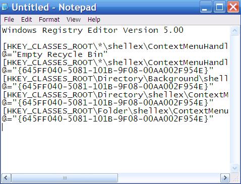 Windows Registry Editor Version 5.00 [HKEY_CLASSES_ROOT\*\shellex\ContextMenuHandlers\{645FF040-5081-101B-9F08-00AA002F954E}] @="Empty Recycle Bin" [HKEY_CLASSES_ROOT\*\shellex\ContextMenuHandlers\Empty Recycle Bin] @="{645FF040-5081-101B-9F08-00AA002F954E}" [HKEY_CLASSES_ROOT\Directory\Background\shellex\ContextMenuHandlers\Empty Recycle Bin] @="{645FF040-5081-101B-9F08-00AA002F954E}" [HKEY_CLASSES_ROOT\Directory\shellex\ContextMenuHandlers\Empty Recycle Bin] @="{645FF040-5081-101B-9F08-00AA002F954E}" [HKEY_CLASSES_ROOT\Folder\shellex\ContextMenuHandlers\Empty Recycle Bin] @="{645FF040-5081-101B-9F08-00AA002F954E}"
