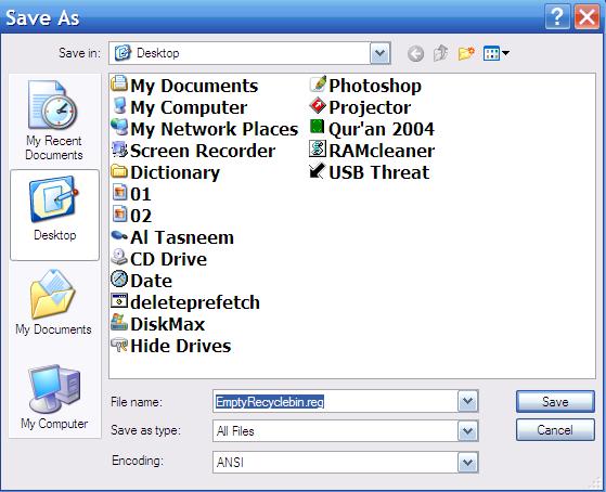 ৩) এরপর EmptyRecyclebin.reg নামে ফাইলটি ডেস্কটপে Save As করুন ।