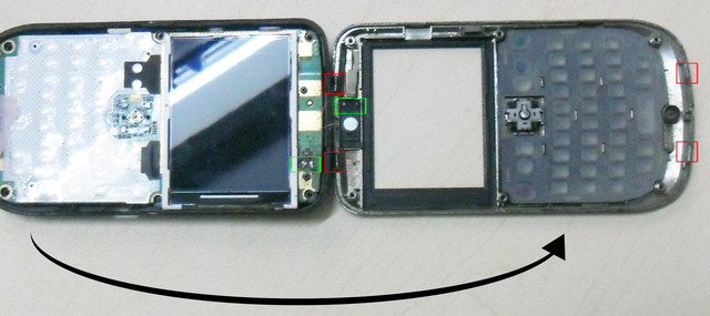 লাল চিহ্নিত অংশ গুলো দিয়ে বুঝিয়েছি যে ওই জায়গা গুলোতে ক্লিপ আছে এবং ওখানেই চারা দিতে হবে । সবুজ চিহ্নিত অংশটি ভালো করে লক্ষ্য করুন । যে অংশের সাথে স্ক্রিন আছে, সেখান থেকে দুটি ছোট তার আপনার ছবির ডান পাশের অংশের সবুজ চিহ্নিত স্পিকারের সাথে গিয়ে যোগ হয় এবং আপনি শুনতে পান । আমি যেভাবে নিচের তির চিহ্ন দিয়েছি সেভাবেই সেটটি খুলতে হবে । নিচের চিত্রটির সাহায্যে আপনাদের সেটটি খোলার আঙ্গেল বোঝাতে চেষ্টা করলাম ।