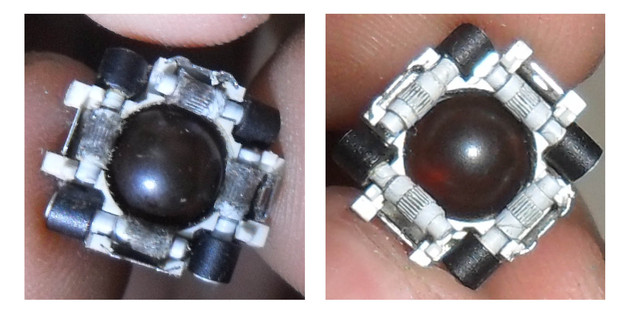 একদম ক্লিয়ার । লক্ষ্য করুন, প্রতিটি চাকার বলের শরীরের সাথে যে চাকার অংশটুকু লেগে আছে সেখানে দাগ কাটা আছে । ওই ঘরের সাথে বলের ঘর্ষনে চাকা ঘোরে । কিন্তু, যখন চাকায় ময়লা জমে তখন আর সেই চাকাটি ঘুরতে পারেনা । এজন্যই ট্র্যাক বল কাজ করেনা । যাই হোক, নিচের ছবিটি দেখুনঃ