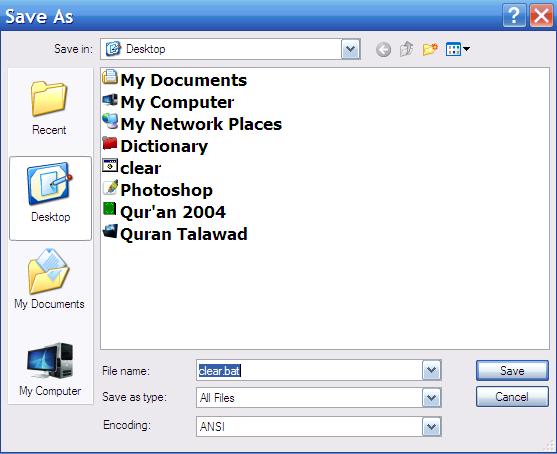 ৪) এবার File > Save As এ ক্লীক করুন । File Name: Clear.bat এবং Save as type : All files সিলেক্ট করুন । অত:পর এটি ডেস্কটপে Save করুন ।