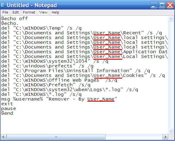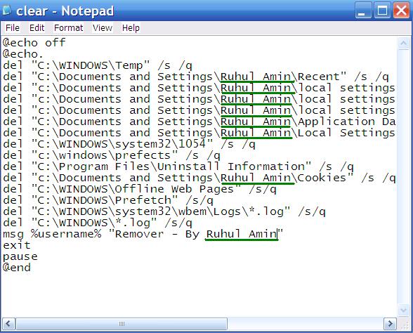এই ফাইলগুলো পরিষ্কার করতে আমরা বিভিন্ন ধরনের সফটওয়্যার ব্যবহার করি । তাছাড়া %Temp%, Temp , Recent, prefect, Cookies প্রভৃতি পরিষ্কার করতে রানে গিয়ে এগুলো লিখে এন্টার চেপে সিলেক্ট করে ডিলেট করি । আপনি চাইলে একটি ব্যাচ ফাইল তৈরী করে উপরোক্ত ফাইলগুলো অতিসহজে মুছে ফেলতে পারেন । আর কথা না বাড়িয়ে আসুন নোটপ্যাডে একটি ব্যাচ ফাইল তৈরী করি এবং ডাবল ক্লীক করে সব অপ্রয়োজনীয় ফাইল মুছে দেই ।