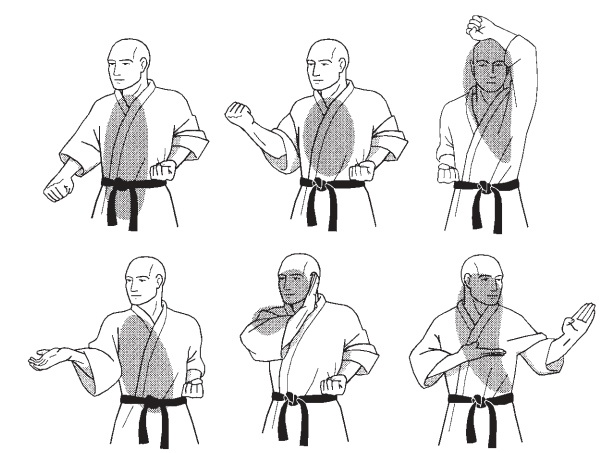 নিচের ছবিগুলো লক্ষ্য করুন। এখানে শরীরের প্রথম ভাগ রক্ষার ব্যাপারে দেখানো হয়েছে। একহাত যখন মাথার উপর তুলে ব্লক করবেন, অন্যহাত তখন আপনার কোমরের কাছে থাকবে। হাতের অবস্থান ভালমত দেখে প্র্যাকটিস করুন। এগুলো প্রায় সবই ইউ টিউবে পাবেন। যেহেতু আমাদের দেশের নেট স্পিড কম সেহেতু সেগুলোর লিংক দিচ্ছিনা। আপনার যেসব বুঝতে অসুবিধা সেগুলো ইউটিউবে ভিডিও দেখে নিলে অনেক সুবিধে হবে।
