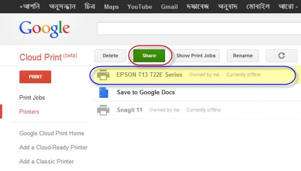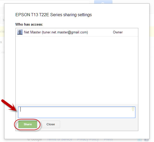 এর পর যাকে শেয়ার করবেন তার জিমেইল ঠিকানা তীরযুক্ত জায়গায় দিয়ে Share এ ক্লিক করুন! আপনার প্রিন্টার শেয়ার হয়ে যাবে।