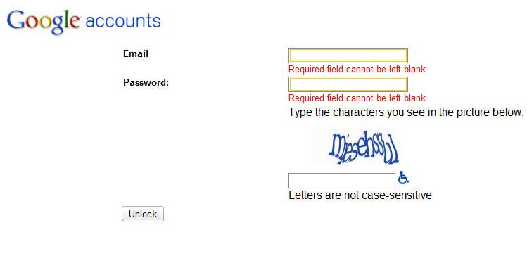 অনেক তো বকর বকর করলাম। এবার আসি কাজের কথায়। লক হয়ে গেলে কিভাবে আনলক করবেন। আপনার গুগুল একাউন্ট লক হয়ে আপনি Google Unlock captcha page ব্যবহার করতে পারেন। এখানে আপনি আপনার লগইন ইনফরমেশন বসান। এরপর ‘Unlock’ বাটনে ক্লীক করুন। কিন্তু একটা সত্য কথা বলি তা হল এই পদ্ধতিতে আপনি আপনার একাউন্ট যে আনলক করতে পারবেন তার 100% গ্যারান্টি আমি দিতে পারব না। তবে এটা বলতে পারি যে এটা ট্রাই করলে আপনার একাউন্টের কোন ক্ষতি হবে না।