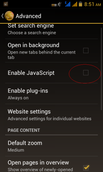 এখন ব্রাউজার ওপেন করুন option> setting>advanced>enable javascript টিক চিহ্ন টা তুলে দেন।