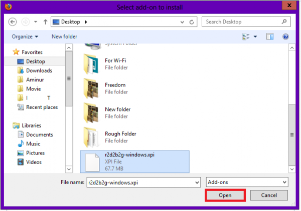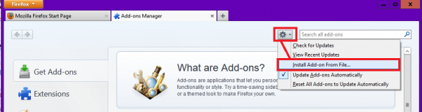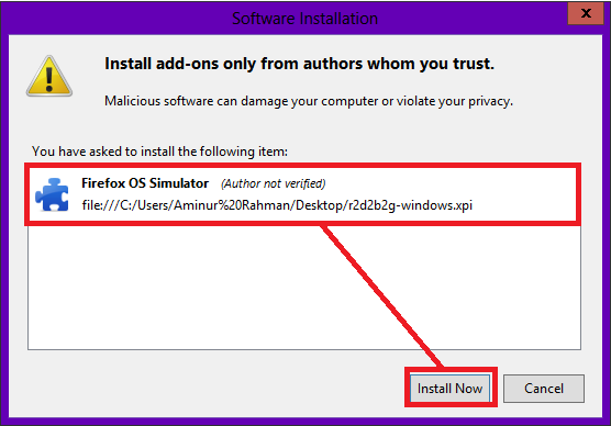 এখানে Settings আইকন থেকে Install Add-on from File এ ক্লিক করতে হবে। এবার পিসি থেকে ফাইল বাছাই করার নতুন একটি উইন্ডো চালু হবে। এখানে আপনার ডাউনলোড করা সিমুলেটর এক্সটেনশনটি নির্বাচন করে দিয়ে Open এ ক্লিক করতে হবে। ব্রাউজারে একটি ডায়রগ বক্স আসবে। Install Now এ ক্লিক করলে অল্প কয়েক সেকেন্ডের মধ্যে এক্সটেনশনটি আপনার ব্রাউজারে যোগ হয়ে যাবে।
