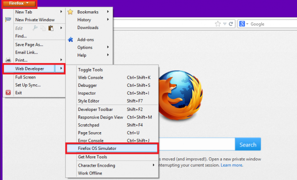 ব্রাউজারটি বন্ধ করে আবার চালু করুন। এবার Tools থেকে Web Developer হয়ে Firefox OS Simulator এ ক্লিক করতে হবে। নতুন আইকন আসবে।
