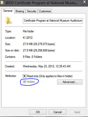 উপরের ছবিটা দেখেই বুঝতে পারছেন একটি Folder চিরতরে Hidden হয়ে গেছে। চাইলেই Unhide করা যাবে না। কারণ এর টিক মার্ক উঠানো যাবে না। এই অপশনটা Disable অবস্থায় আছে। এই অবস্থায় আপনি Folder Option এ গিয়ে সব ধরণের Hidden File শো করে দিলে ফাইলটা আপনার পিসি তে শো করবে। কিন্তু এটাকে unhide করা যাবেনা এটা কোন কথা হল?? এত সহজে কি এমন বাজে ব্যাপার মেনে নেওয়া যায়? মোটেই না। না বলে কোন শব্দ নেই। (আসলে কিছু কিছু ক্ষে্ত্রে না বলেও শব্দ আছে! 😉 )