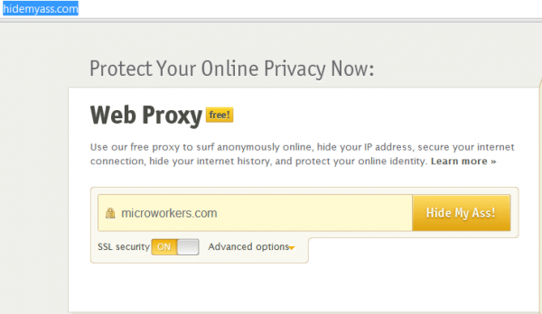 সাইটটিতে যান এবং নিচের দেখানো ইনপুট বক্সে আপনার সাইট এর নাম লিখুন এবং Hide my ass বাটনে ক্লিক করুন । আমি Microworkers.com ব্যবহার করেছি ।