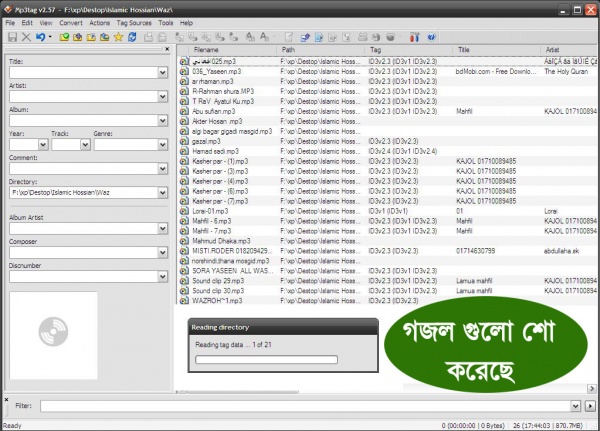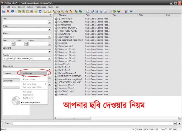 আমরা যারা যখন Windows media player ও মোবাইলের মিউজিক প্লেয়ারে যখন mp3 গজল প্লে করি তখন অনেক গানের সাথে আমরা বিভিন্ন ছবি দেখতে পাই। অন্যনের ছবি দেখে আমার আপসোস করতাম যদি আমার ছবি এভাবে দেওয়া যেত, এই কাজটা Windows media player করা যায় কিন্ত একটা একটা করে করা যায়, আজ আমি আপনাদের এমন একটি Software এর সাথে পরিচয় করিয়ে দেব যার দ্বারা আপনারা এক সাথে অনেক গুলো গজলের সাথে নিজের ছবি দিতে পারবেন।