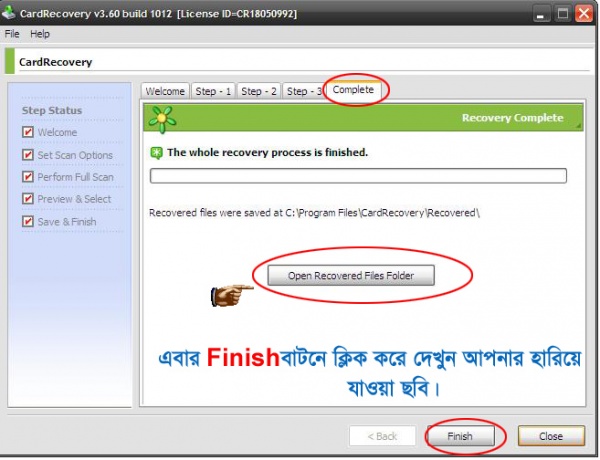 সবশেষ Complete এ এসে Open Recovered Files Folder বাটনে ক্লিক করুন আর দেখুন আপনার হারিয়ে যাওয়া ছবি বা ফাইল এবার সব ফাইল কাট/কপি করে Save করে রাখুন।