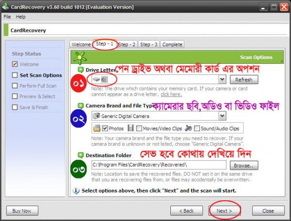 এবার Step-1 থেকে Drive Letter: আপনার পেন ড্রাইভ অথবা মেমোরী কার্ড দেখিয়ে দিন আমার পেন ড্রাইভ কে তাই আমি K সিলেক্ট করেছি, আপনি আপনার ড্রাইভ লেটার অনুযায়ী সিলেক্ট করুন।