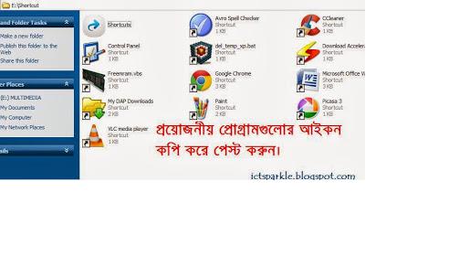 ২/এবার আপনার দরকারি প্রোগ্রামগুলোর আইকন কপি করে Shortcut নামে যে ফোল্ডার টি তৈরি করা হল সেখানে পেস্ট করুন।স্ক্রিন শট দেখুন।