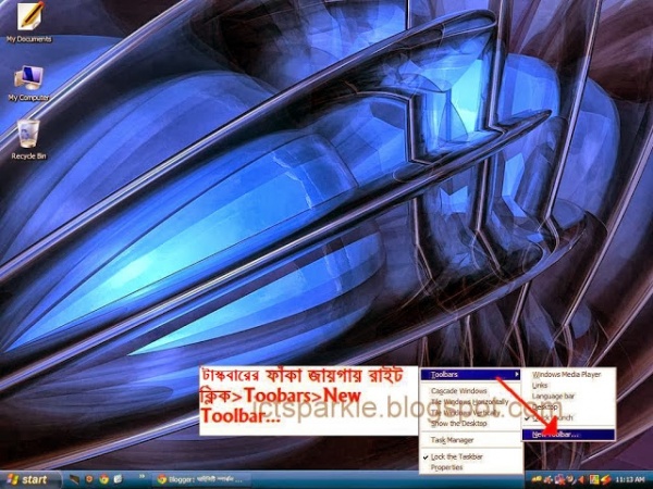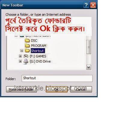 ৩/এবার আপনার ডেক্সটপে গিয়ে টাস্কবার এর ফাঁকা জায়গায় রাইট ক্লিক করুন। তারপর "Toolbars" এ ক্লিক করে "New Toolbar..." এ ক্লিক করুন।নিচের স্ক্রিন শট দেখুন।