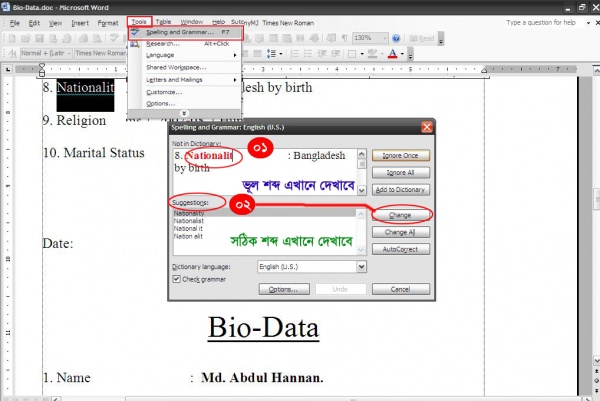 তারপর MS Word এর Tools মেনুতে ক্লিক করে >> Spelling & Grammar এ ক্লিক করুন তাহলে একটি Dialog box আসবে।এখানে Not in dictionary বক্স এ আপনার ভুল লেখাটা লাল দেখাবে। এখন এই ভুল লেখাটা শুদ্ধ করতে হলে Suggestions বক্স থেকে শুদ্ধ বানান সিলেক্ট করে Change এ ক্লিক করলে বানান শুদ্ধ হয়ে যাবে। সবশেষ ok ক্লিক করুন অথবা কিবোর্ড থেকে F7 চাপ দিলে Spelling &Grammar বক্স আসবে।