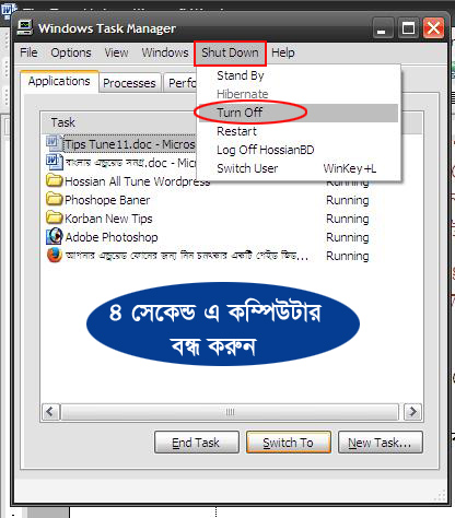 এর জন্য আপনার কিবোর্ড থেকে Ctrl +Alt +Delete এক সাথে চাপুন। তাহলে Windows Task Manager ডায়ালগ বক্স আসবে। এবার Shut Down মেনুতে ক্লি করে- কি-বোর্ড থেকে Ctrl চেপে ধরে Turn of ক্লিক করুন তাহলে কম্পিউটার ৪/৫ সেকেন্ডে বন্ধ হয়ে যাবে।