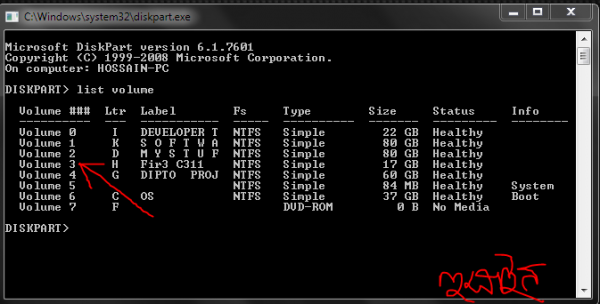 দ্বিতীয় ধাপঃ আগের মতই টাইপ করুন “list volume” (কোন কোটেশন থাকবে না)