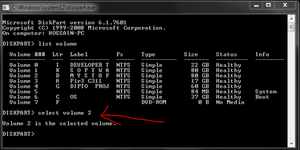 তৃতীয় ধাপঃ এবার আপনি কোন ড্রাইভ হাইড করছিলেন কমান্ডের মাধ্যমে ওই ড্রাইভ সিলেক্ট করুন আগের মতই মানে “select volume2” (কোন কোটেশন থাকবে না)