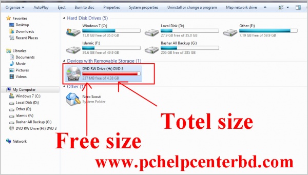 এবার কিছুক্ষণের মধ্যে’ই আপনার সিডি/ডিভিডিটি বেরিয়ে আসবে। তারপর সেটি আবার প্রবেশ করান, তারপর মাই কম্পিউটারে গিয়ে দেখুন সিডি/ডিভিডি পেয়েছে কিনা, না পেলে একটু অপেক্ষা করুন, মাই কম্পিউটারে শো করবে, শো করলে দেখুন নিচের মত দেখা যাবে, কতটুকু ব্যবহার হয়েছে এবং কতটুকু খালী আছে। যদি খালী থাকে এটিকে আবার পরবর্তীতে একবার রাইট করতে পারবেন, কিন্তু সেটা শুদু পিসিতে সাপোর্ট করবে, আর অনেক সময় দ্বিতীয় বার রাইট করতে গেলে সিডি/ডিভিডি নষ্ট হয়ে যায়। তাই একবার রাইট করা’ই ভাল