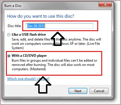 Disc title: এখানে আপনার সিডি/ডিভিডিটির কি নাম থাকবে সেটি লিখে দিন। মনে রাখবেন আবার লিমিট ওভার করে লিখিয়েন না, অল্প ওয়ার্ডের মধ্যে লেখার চেষ্টা করুন, এর কত ওয়ার্ড লিমিট সেটা আমার জানা নেই, তাই বলতে পারছি না (দুঃখিত)। এখন নিচের Write a CD/DVD Player এটি সিলেক্ট করুন। এবার Next এ ক্লিক করুন।