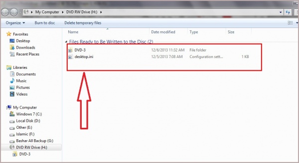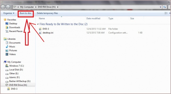 এখানে উল্লেখ্য যে, আপনার কম্পিউটারে যদি হিডেন ফাইল শো করানো থাকে তাহলে তাহলে নিচের desktop.ini ফাইলটি দেখা যাবে, আর যদি হিডেন ফাইল শো করানো না থাকে তাহলে এটি হাইড থাকবে ফলে আপনি এখানে একটি ফোল্ডার দেখতে পাবেন, তবে এই ফাইলটি ডিলেক্ট করা যাবে না, ডিলেক্ট করলে সিডি রাইট হলেও ডাটা সাপোর্ট করবে না। এবার আপনি নিচের ছবিটিতে দেখান লোকেশনে Burn to disc নামে অপশন দেখতে পাবেন সেখানে ক্লিক করুন।