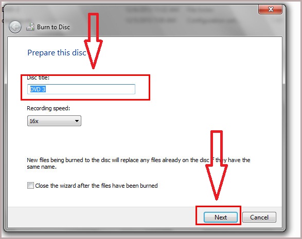 Burn to disc এ ক্লিক করার সাথে সাথে নিচের পিক্সারটির মত একটি ডায়েলক বক্স আসবে সেখানে আবার লিখুন আপনার সিডি/ডিভিডির নাম কি হবে এরপরে next এ ক্লিক করুন।