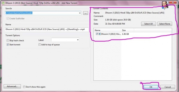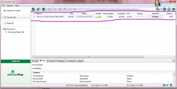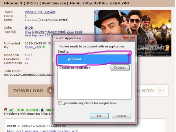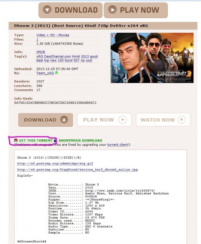 লক্ষ করুন সার্চ রেজাল্টে যেগুলোর পাশে সবুজ টিক চিহ্ন আছে, সেগুলোই ভেরিফাইড। এর পরে দেখুন সময় দেখাচ্ছে, এর মানে হলো কতদিন হয়েছে টরেন্টটি শেয়ার করা হয়েছে। এর পরে কালো দাগ দেওয়া বক্সে যে সবুজ রং এর কিছু সংখ্যা লেখা তা হল সিড এর সংখ্যা। অর্থাৎ এই সংখ্যক লোকের কাছে dhoom 3 এর পুরো ফাইলটি আছে এবং তারা তা সিড করছে। এর পরে নীল অক্ষরে লেখা সংখ্যাগুলো হল পিয়ার এর সংখ্যা। অর্থাৎ এরা বর্তমান dhoom 3 ফাইলটি ডাউনলোড করেছে। সুতারাং যেটির সিড ও পিয়ার সংখ্যা বেশী দেখবেন সেটাই ডাউনলোড করবেন তাই স্পীড ও ভাল পাবেন। এবার রেজাল্ট থেকে যে কোন একটিতে ক্লিক করুন, নিচের মত দেখবেন........................