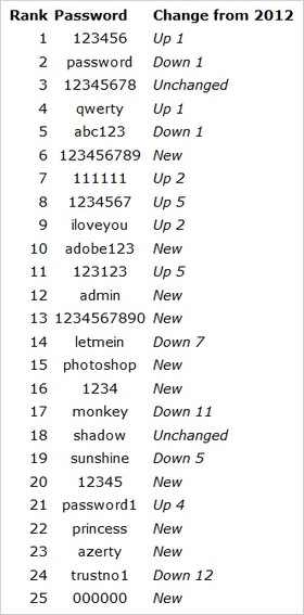 প্রতি বছরের মত এবারো SplashData সবচেয়ে দূর্বল পাসওয়ার্ডগুলোর তালিকা প্রকাশ করলো। এতে দেখা গেছে ২০১৩ সালের সবচেয়ে জনপ্রিয় পাসওয়ার্ড ছিল ‘১২৩৪৫৬’ এর আগের বছরে শীর্ষস্থানে থাকা পাসওয়ার্ড ‘password’ এবার চলে এসেছে ২য় অবস্থানে। ২৫টি পাসওয়ার্ড বিশ্লেষন করে দেখা যায় সবচেয়ে সহজে অনুমানযোগ্য পাসওয়ার্ডগুলোই তালিকার শীর্ষে রয়েছে।