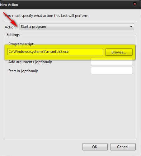 Action: Start a program, Program/Script: Browse.. এ ক্লিক করে যে কোন সফটওয়্যার সিলেক্ট করে ok তে ক্লিক করুন। এভাবে ইচ্ছা করলে আপনি একাধিক সফটওয়্যার অ্যাড করতে পারবেন।