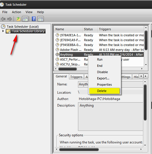 অফ করতে হলে Task Scheduler আবার ওপেন করে Task Scheduler Library থেকে আপনার দেওয়া টাস্কের নাম খুঁজে বের করে রাইট মাউসের রাইট বাটনে ক্লিক করে ডিলিট এ ক্লিক করুন।
