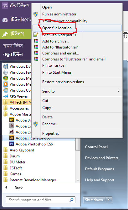 এখন এই ফাইল টি কপি করুন এরপর আপনার Start Menu -> All Programs -> Adobe Master Collcetion -> Adobe Illastrator এর উপর মাউস এর রাইট বাটন ক্লিক করুন এরখন দেখেন নিচের মত দেখতে পাবেন