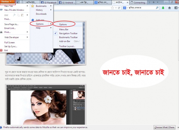 এখব দেখবেন এই সাইট থেকে কিছুই কপি করা যাচ্ছে না! এখন আমাদের কপি করতে হলে, ফায়ারফক্স মেনুবার থেকে Tools > Options এ ক্লিক করুন।