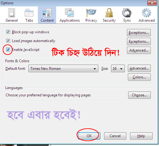এবার Content অপশনে ক্লিক করে Enable JavaScript এর মার্ক তুলে দিয়ে OK করুন।