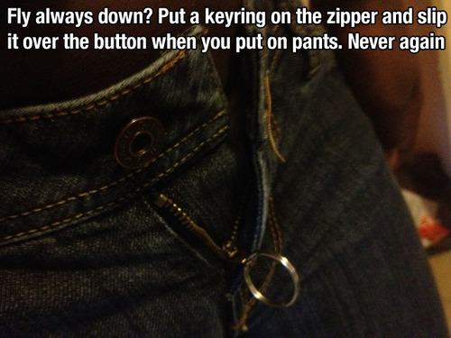 প্যান্টের জিপার নেমে যায়? জিপারের সাথে একটা চাবির রিং লাগান। তারপর জিপার বন্ধ করে রিংটা উপরের বাটনের সাথে আটকে দিন। ইজ্জত বাঁচবে।