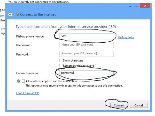 এখন নিছের ছবির দিকে একটু খেয়াল করুন। এখানে আপনার কিছু কাজ করতে হবে। এখানে Dial up phone number এর ঘরে নাম্বার লিখতে হবে। আপনি যে অপারেটর এর কানেকশন ব্যবহার করেন সেটার ডায়েল আপ নাম্বার লিখতে হবে। যেমন জিপি এর জন্য *৯৯# , বাংলালিংক এর জন্য *৯৯***১# বাকি গুলো আমার জানা নাই। আপনার নিজ দায়িত্তে সংগ্রহ করে নিবেন।