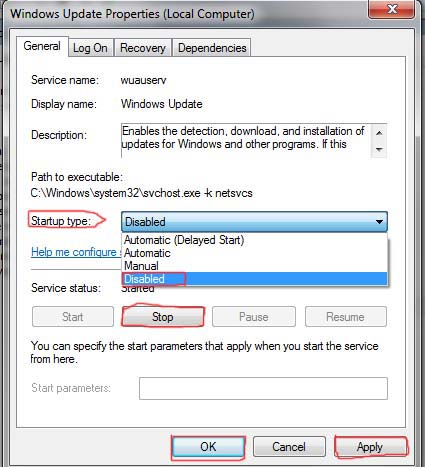 এবার আপনি startup type থেকে disabled সিলেক্ট করে stop এ ক্লিক করুন তারপর apply এবং ok করুন। ব্যাস আপনার কাজ শেষ। আপনার সমস্যাটি চিরদিনের জন্য বন্ধ হয়ে যাবে যতক্ষণ না পুনরায় উইন্ডোজ সেটাপ দিবেন।