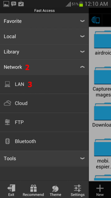 প্রথমে ফোনে app দুইটা instal করে নিন ৷ MX player এটা সবার কাছে আছে তাই এটার লিংক দিলুমনা , এবার ল্যাপটপের wifi hotspot এর সাথে আপনার এন্ড্রয়েড কানেক্ট করুন ৷ ES File Explorer চালু করুন এবং fast access menu (বামদিকে উপরে কোনায়) থেকে Network ও তারপর LAN সিলেক্ট করুন৷