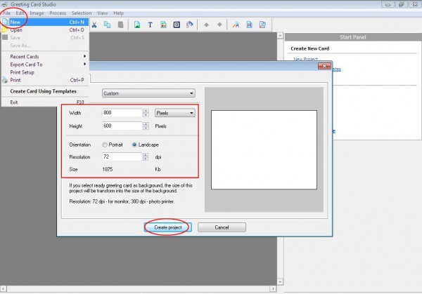 এবার File>New> বাটনে ক্লিক করুন তারপর পছন্দের সাইজ দিয়ে Create Project এ ক্লিক করুন।