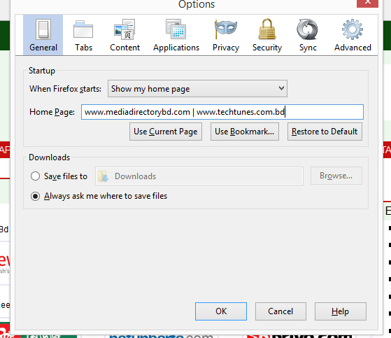 এবার নতুন ডায়ালগ বক্স ওপেন হবে। এখানে General ট্যাব এ ক্লিক করুন। এরপর Startup এ When Firefox starts : এ Show my home page সিলেক্ট করুন। Home Page : এর খালি জায়গায় ওয়েবসাইট এড্রেস http://www.twitter.com লিখুন। এরপর Ok বাটনে ক্লিক করুন।