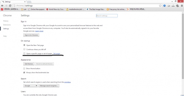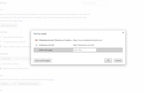 settings এ ক্লিক করলে নিচের মতো নতুন ইউন্ডো আসবে। এখানে on startup অপশনের Open a specific page or set of pages. রেডিও বাটনে ক্লিক করুন। এরপর Set pages এ ক্লিক করুন। তাহলে আবার নতুন একটি পপআপ বক্স ওপেন হবে। এখানে Add a news page এর ফাকা স্থানে আপনার ওয়েবসাইট এড্রেসটি লিখুন। (আমি এখানে একটি ডিরেক্টরি সাইট এর এড্রেস লিখেছি। কারণ এই ডিরেক্টরি সাইট থেকে বাংলাদেশের মেক্সিমাম নিউজ সাইটে যাওয়া যায়। ডিরেক্টরিটির এড্রেস http://www.mediadirectorybd,com)