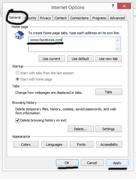 Internet Options ডায়ালগ বক্স আসবে। General ট্যাবে ক্লিক করুন। Home page এর নিচের text box এ কিছু লেখা থাকলে সেটি মুছে আপনার ওয়েবসাইট এড্রেসটি (www.facebook.com) লিখুন। Apply এ ক্লিক করে ok তে ক্লিক করুন। এরপর ব্রাউজারটি রিস্টার্ট দিন। দেখুন ব্রাউজার চালু হবার সাথে সাথেই facebook ওয়েবসাইটটি চালু হচ্ছে।