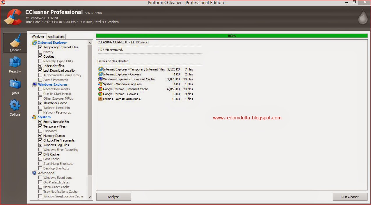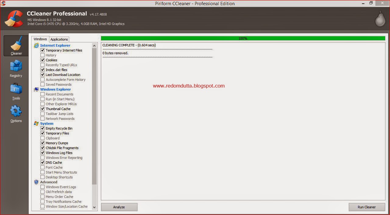 এইখান থেকে আপনি সিলেক্ট করে দিয়ে পারবেন যে কি ধরনের ফাইল আপনি ক্লিন করতে চাচ্ছেন যেমন আপনি চাননা যে আপনার রানবক্স এ যা টাইপ করেন তা মুছে ফেলুন বা চান না যে আপনার ইন্টারনেট ওয়েব ব্রাউজার যেমন mozila firefox google come এর হিসট্রি মুছে ফেলুক। এসব কিছু আপনি নির্ধারন করে দিতে পারবেন। যা নির্ধারন করতে চান সেগুলার উপর টিকচীর্ণ দেন এর পর Analyze বোতামে এ ক্লিক করুন নিচের মত একটি উইন্ডো আসবে।
