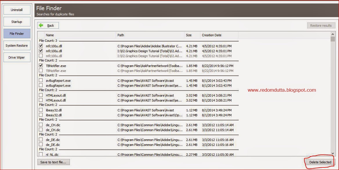 সার্চ বাটন এ ক্লিক করুন নিচের মত একটি উইন্ডো আসবে। এইখান থেকে ডুপলিকেট ফাইল সিলেক্ট করে ডিলিট বাটন এ ক্লিক করুন।
