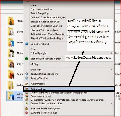 winrar এর কাজ হল হলো RAR বা ZIP File খোলার জন্য একটি অসাধারন এক সফটওয়্যার। যা দিয়ে খুব সহজেই ফাইল কম্প্রেস করা যায়। মনে করুন আপনি মেইল করে ১০০ টা ছবি একজন কে পাঠাবেন তখন আপনার একটি একটি করে ফাইল আপলোড করতে অনেক সময় লাগবে। Winrar এর মাধ্যমে আপনি খুব সহজে ১০০ টি ফাইল কে ১টি ফাইল এ রূপান্তর করতে পারবেন। যারা কম্পিউটার এর একদম নতুন ব্যাবহারকারি তারা নিচের টিপস গুলো দেখুন ।যে ফাইল টি জিপ করতে চান সেইটির ওপর মাউস এর রাইট বাটন এ ক্লিক করে Add To Archive এ ক্লিক করুন।