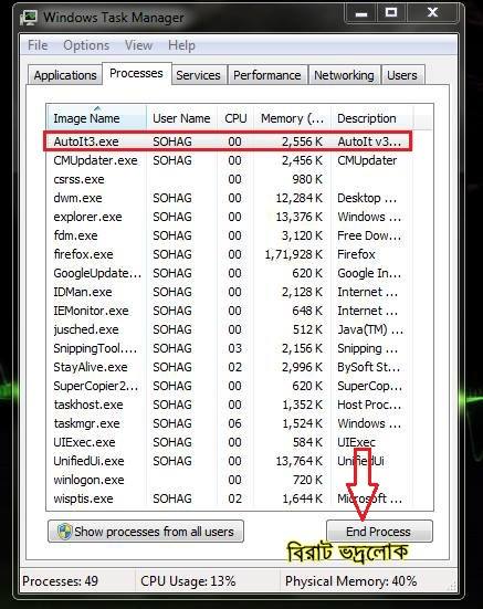 এমন থাকলে এখন Ctrl + shift + esc চেপে windows Task Manager ওপেন করে Processes এ ক্লিক করে Autoit3.exe টি রিমুভ করে দিন নিচের মত 😯